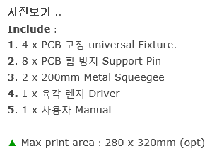 본 장비는 소량 다품종 생산에 적합한 장비이다. Solder Printer에서 제일 중요한 작업은 Squeegee이며, 반복적 작업에도 균일한 품질이 가능한 Double Squeegee가 가능한 장비이며, 양면 PCB 작업이 가능한 Solder Printer입니다.