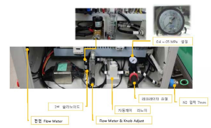 N2 개페 자동이며, 또한 N2 량 역시 10 ~ 140 까지 투입량을 설정 할 수 있다. 이러한 설정 값에 따라 자동으로 N2 량 제어를 자동으로 한다, 장비 내부에 N2 regualtor 및 Solranoide N2 제어 자동으로 한다.