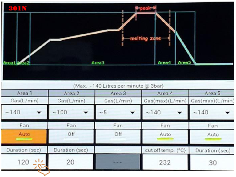 JEDEC 구간 N2 투입량. 시간등을 입력하면된다, Area1 Reflow 작동되기 전 N2 투입 설정하는 내용으로 고품질 Reflow 환경을 요구 할 시 설정을 한다. 120 sec은 장비 투입전 퉁비 시간이다. 이 설정 값은 사용에 따라 변경 가능하다.