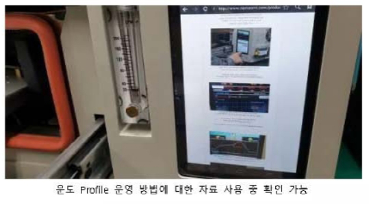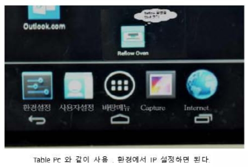 JEDEC 환경 온도 제어 방식 과 전문가를 위한 max 100 온도 구간설정 가능한 2가지 운영프로그램을 화면에서 선택 사용 할 수 있다. 2종류 어떠한 프로그램을 실행하더라도 real time 온도 Profile 구현 및 N2 투입량등을 화면 FLow Meter 통하여 모니터링된다. 온도 진행 어떠한 환경에서도 화면 caputure 가능하며, Capture 된 화면은 email 전송 가능한 Tablet PC 와 같은 Android platform 설계된 reflow 장비이다.