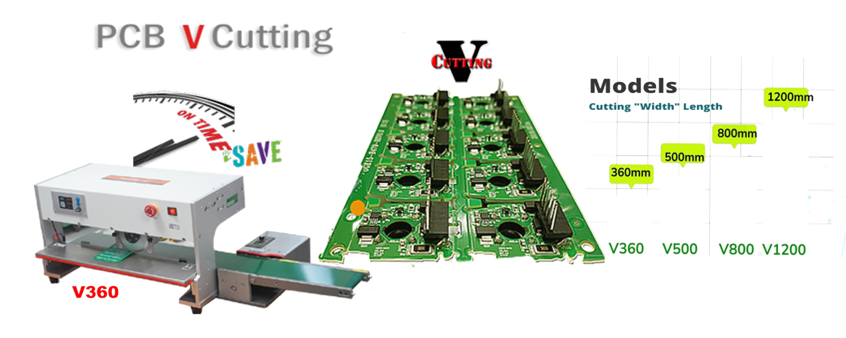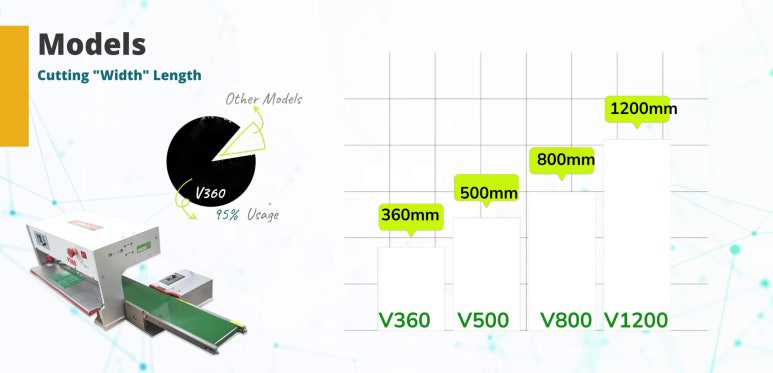 V Series PCB 커팅 장비는 360 (실제 커팅 폭 360mm)부터 500mm. 600mm. 700mm, 800mm, 1,000mm
